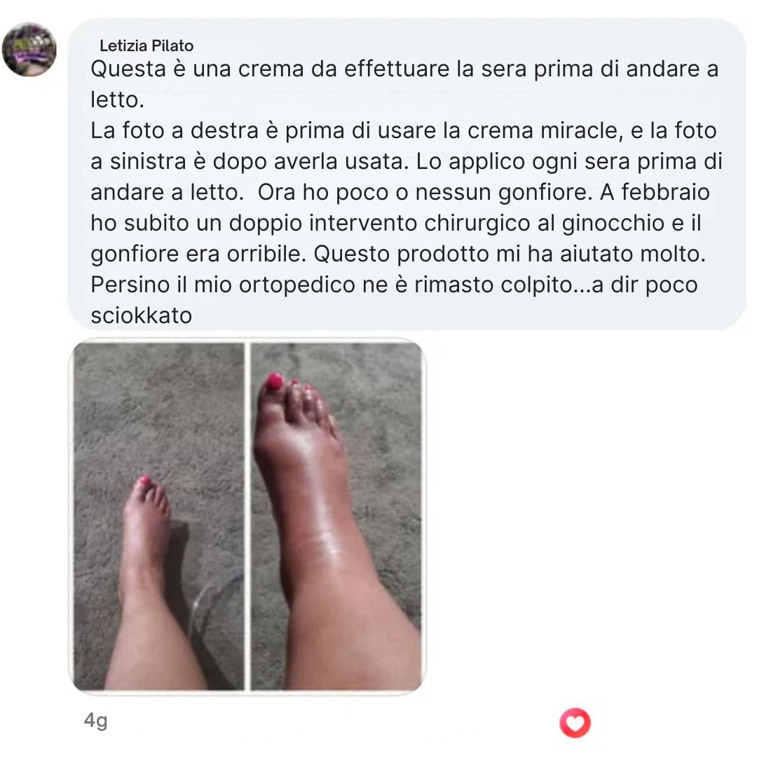 “Le mie caviglie si gonfiavano ogni sera. Con la Crema Miracle, ora sono più leggere e vedo che il gonfiore si riduce.”